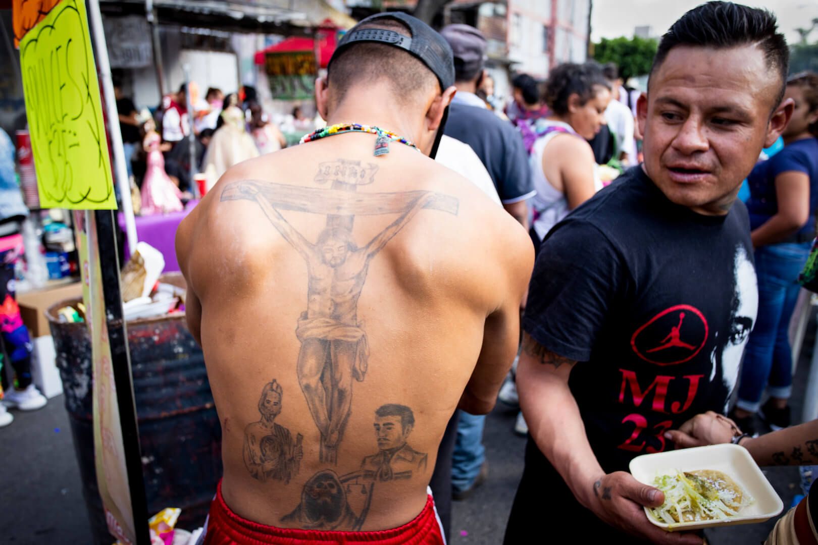 But where else should I feel safer than here, in the immediate presence of the most emblematic altar of Santa Muerte, who protects everyone without any distinction - since everyone is entitled to death - and is therefore the patron saint of criminals and gangsters, because the saint in the form of a grim reaper dressed in a splendid dress does not judge, and so she also watches over all those stray souls who have gathered here and who have tattooed tears around their eyes and crosses. They have come here to bow down to her and to make offerings and gifts to guard them on their wild journeys through life.
